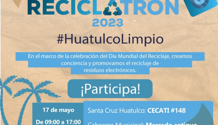 EventosMunicipio Reciclatrón Huatulco 2023 By Yvan Luna On May 12, 2023 25 Share ¿Tienes residuos electrónicos almacenados o en casa?Es momento de llevarlos a los centros de acopio Este 17 de mayo de 9:00 am a 5:00 pm En dos localidades:Santa Cruz Huatulco: Cecati 148Cabecera municipal: Mercado antiguo. Día Mundial del reciclajeGobierno Municipal HuatulcoHuatulcoNoticias en HuatulcoReciclatón Huatulco 2023 25 Share FacebookWhatsAppTwitterGoogle+PinterestEmail