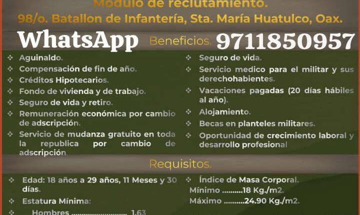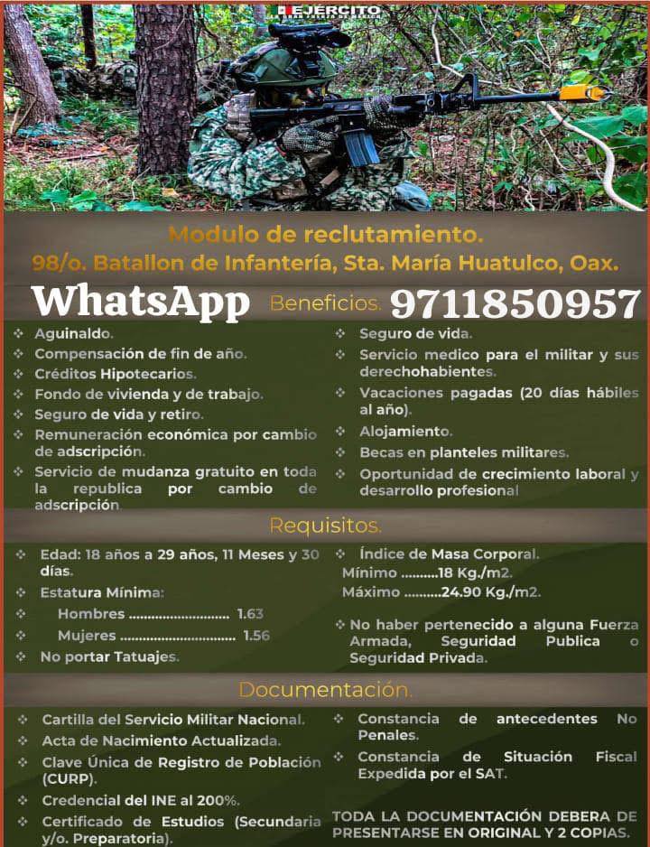 El 98 Batallón de Infantería, en Huatulco, invita a hombres con vocación de servicio a integrarse al Ejército Mexicano, contribuyendo al fortalecimiento de la seguridad y el bienestar del país.