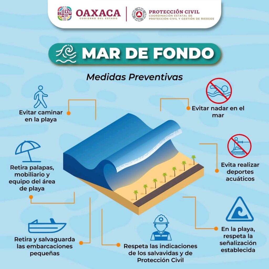 La Coordinación Estatal de Protección Civil y Gestión de Riesgos (CEPCyGR) informa a la población sobre la presencia de mar de fondo en la zona costera de Oaxaca, fenómeno que genera oleaje elevado, fuertes corrientes marinas y aumento en el nivel del mar, representando un riesgo para la población.