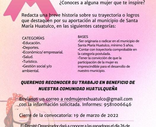 Red de Mujeres Revolucionando Huatulco invita a todas las organizaciones, instituciones, comunidades, centros laborales, grupos sociales o ciudadanos de este municipio a participar proponiendo a mujeres inspiradoras. ¡Inscríbete o postula a quien esté trabajando en beneficio de nuestra comunidad!