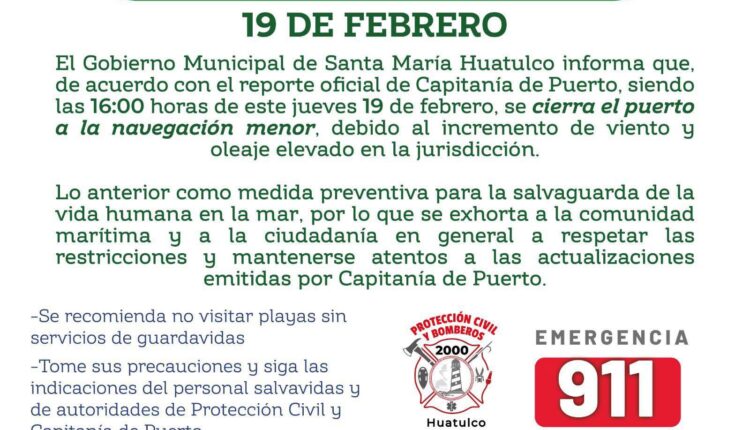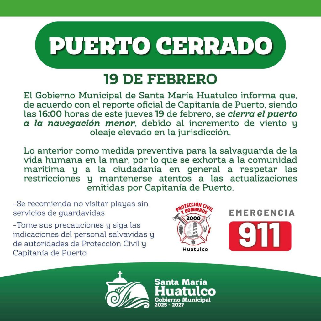 El Gobierno Municipal de Santa María Huatulco informa que, de acuerdo con el reporte oficial de Capitanía de Puerto, a partir de las 16:00 horas del jueves 19 de febrero se cierra el puerto a la navegación menor, debido al incremento de viento y oleaje elevado en la jurisdicción.