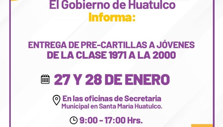Se les comunica a los jóvenes que ya tramitaron su pre-cartilla, pasar por la misma a las oficinas de secretaría municipal, el día 28 de enero de 9:00 a 17:00 hrs en Santa María Huatulco.