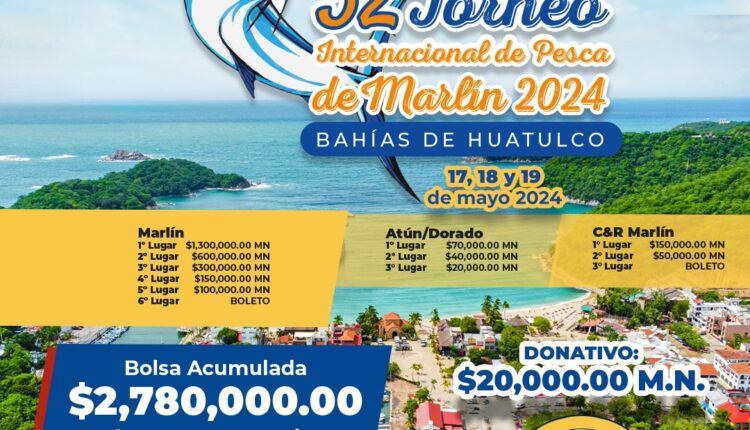 EventosMunicipio Torneo Internacional de Pesca de Marlín 2024. By Yvan Luna On Abr 14, 2024 15 Share Huatulco te espera el próximo 17, 18 y 19 de mayo para celebrar el Torneo Internacional de Pesca de Marlín 2024. Para mayor información comunicarse al: 958 116 64 78 o 951 474 74 20 15 Share FacebookWhatsAppTwitterGoogle+PinterestEmail