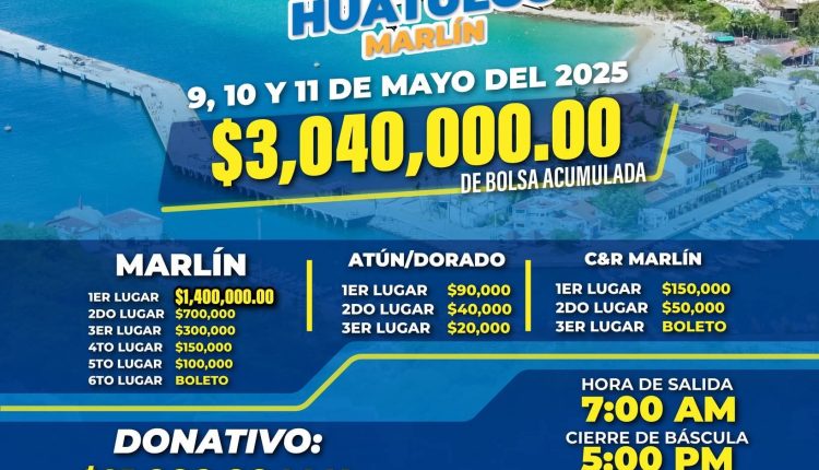 El Gobierno Municipal que preside el Ing. Julio Cárdenas, y el Club de Pesca Deportiva de la Bahía Santa Cruz Huatulco A.C. Invita a todas y todos para que acudan este 9, 10 y 11 de mayo, a las Bahías de Huatulco ya que serán sede de uno de los eventos más esperados, con una bolsa acumulada de $3,040,000 pesos en premios para las categorías Marlín, Atún/Dorado y Catch & Release.
